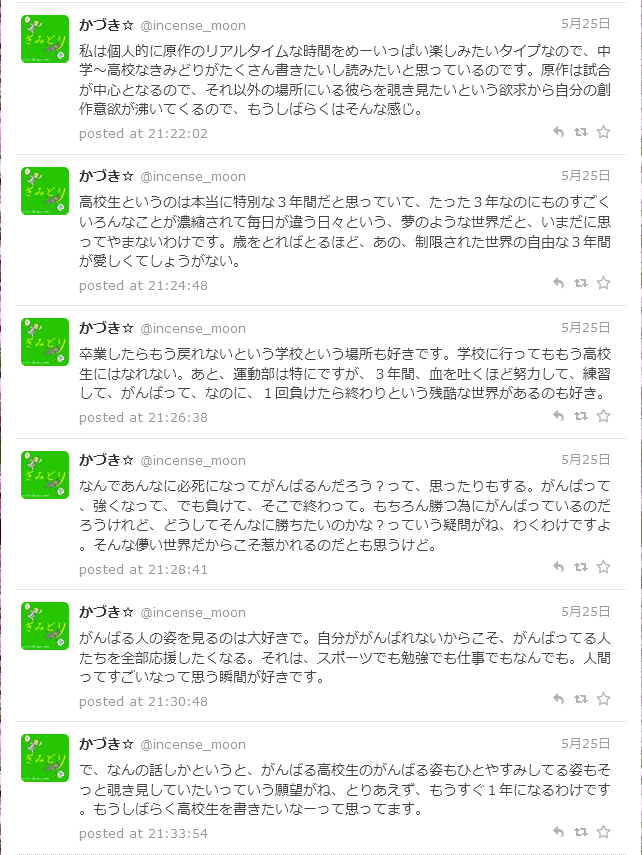 『なんであんなに必死になってがんばるんだろう?って、思ったりもする。がんばって、強くなって、でも負けて、そこで終わって。もちろん勝つ為にがんばって いるのだろうけれど、どうしてそんなに勝ちたいのかな?っていう疑問がね、わくわけですよ。そんな儚い世界だからこそ惹かれるのだとも思うけど。』